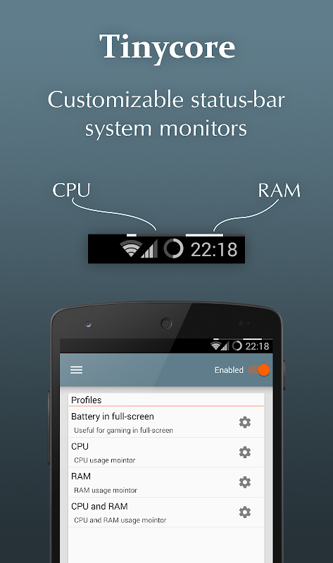 Tinycore features a highly customizable experience, minimalistic and innovative Holo design and is completely designed to be lightweight (low system footprint). With Tinycore monitoring your devices CPU or RAM becomes much easier and interesting.