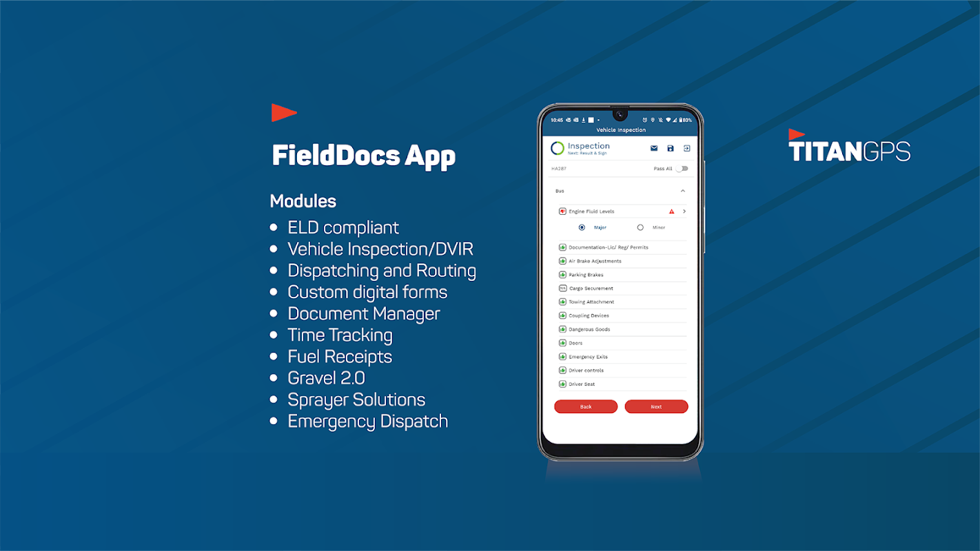 Titan GPS FieldDocs adalah solusi buku catatan elektronik yang sesuai dengan ELD dan alat operasi seluler yang dirancang untuk meminimalkan dokumen, melacak jam layanan (HOS), memusatkan dokumen, dan mengoptimalkan operasi lapangan. Kami menawarkan pelanggan kami berbagai fitur untuk konfigurasi khusus sesuai kebutuhan unik mereka. FieldDocs adalah semua yang Anda butuhkan dalam satu aplikasi manajemen operasi. Aplikasi FieldDocs GPS Titan bekerja bersama dengan pelacakan GPS Titan dan akun manajemen armada Anda untuk membantu Anda melacak dan mengelola data penting bisnis Anda secara real-time.