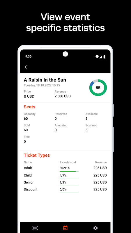 Aplikasi ini memberi pengguna tampilan cepat dari angka-angka terpenting seperti tiket yang terjual hari ini dan kemarin, total pendapatan acara mendatang dan jumlah tiket yang terjual per hari dalam 14 hari terakhir. Kemudian mulailah menjelajahi berapa banyak tiket yang terjual dan berapa banyak pendapatan yang dihasilkan oleh berbagai jenis tiket.