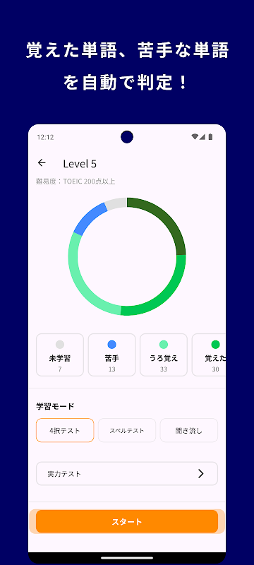Aplikasi ini berisi 2.000 kata dan idiom bahasa Inggris yang diperlukan untuk mencapai skor TOEIC 500, dikategorikan berdasarkan level.