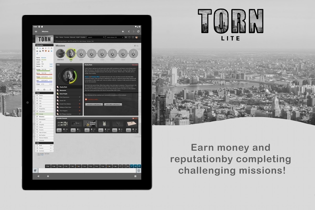 Torn adalah gim multipemain masif berbasis teks yang seru, menegangkan, dan nyata dengan ribuan pemain aktif di seluruh dunia. Bergabunglah dengan mereka, lawan mereka, bertemanlah dengan mereka, nikahi mereka, berjudilah melawan mereka, berdaganglah dengan mereka, bersainglah dengan mereka, berperanglah bersama mereka. Di Torn City, Anda bisa menjadi siapa saja dan melakukan apa saja. Bangun karakter Anda hingga mencapai kekuatan tak terbatas dan mainkan sesuai keinginan Anda.