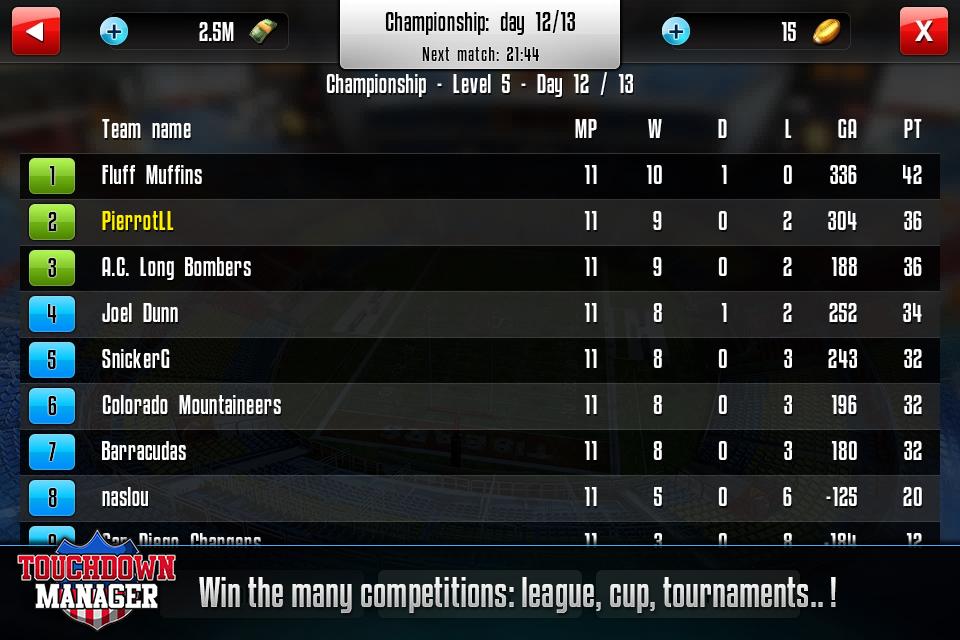 Harap dicatat bahwa Touchdown Manager sepenuhnya gratis untuk dimainkan tetapi beberapa item dalam game akan memerlukan pembayaran.
