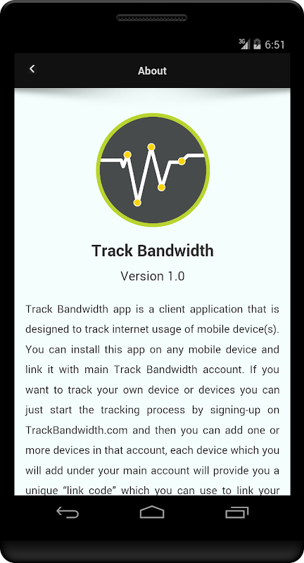 To start this app to actually work, you have to link it with main Track Bandwidth account and after linking you can start tracking internet usage on your main internet account. If you do not have your account on TrackBandwidth.com yet, so you can create it form here http://www.trackbandwidth.com.