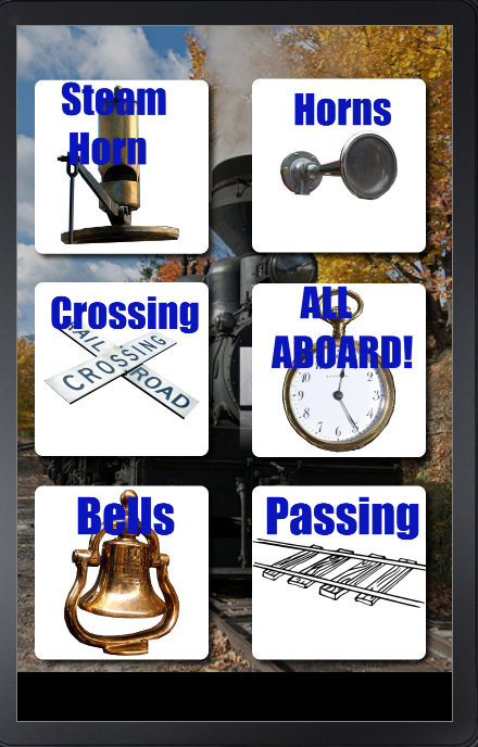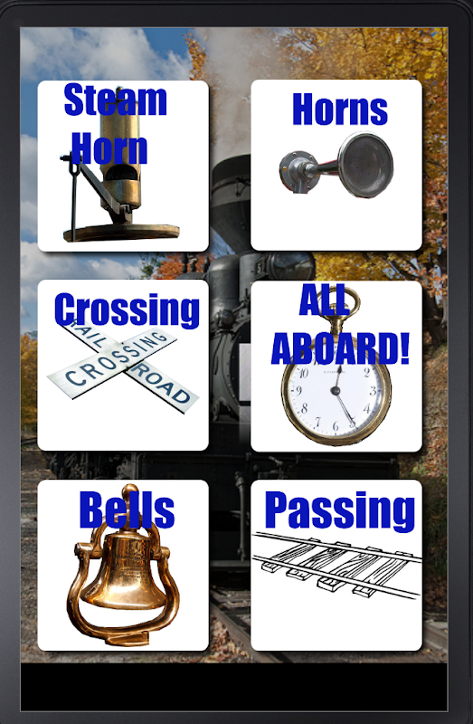 Train horns, bells, crossing signals, and Conductor sounds in a free soundboard. The newest Train Horns app with the best layout. All train horns and sounds located on one page with easy to use buttons with clear labels and horn, bell, and train icons.