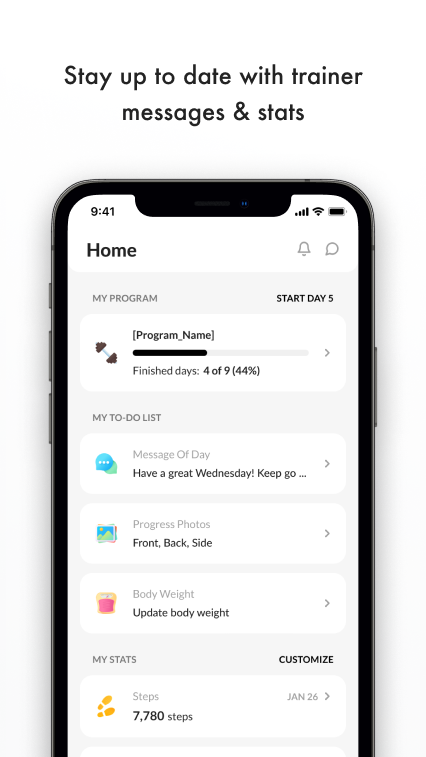 Dari halaman beranda, lihat pesan dari pelatih kebugaran Anda, lihat statistik kebugaran harian Anda, dan lihat ikhtisar nutrisi harian Anda. Di halaman ini, kami juga bekerja sama dengan Apple Health App untuk melacak langkah dan kalori yang Anda bakar.