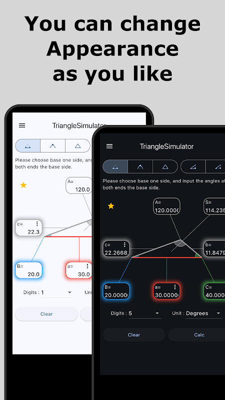 - Anda dapat memasukkan sisi dan sudut dengan mudah menggunakan mode perhitungan segitiga.