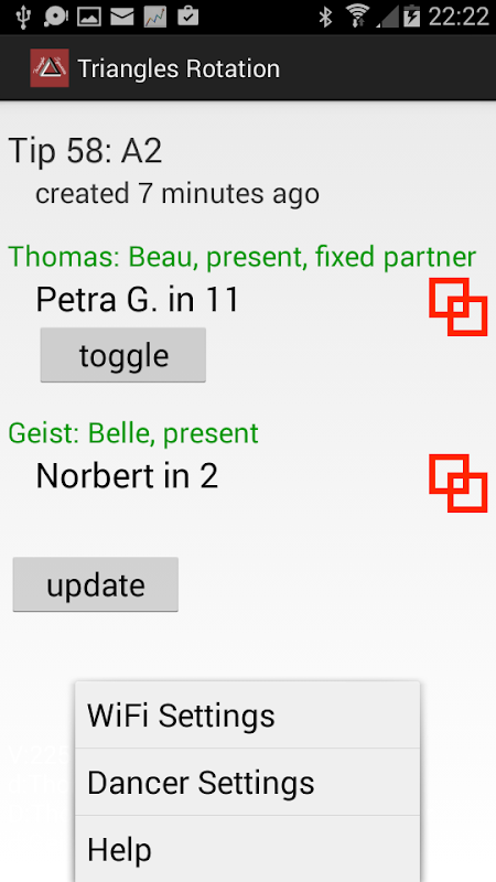 Aplikasi ini memungkinkan penari untuk pencarian pasangan dansa saat dan nomor persegi bahwa mereka di mana ditugaskan oleh Program Rotasi Segitiga.