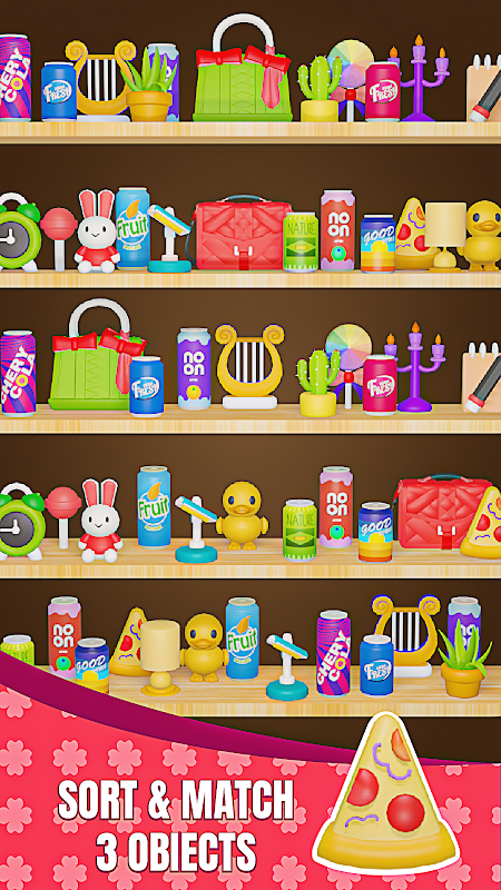 - Mulailah perjalanan Anda melalui dunia permainan sortir kasual, di mana mengendalikan proses sortir menjadi mudah. Cocokkan tiga item dengan menata item 3D yang identik di rak terbuka, selesaikan tiga pertandingan!