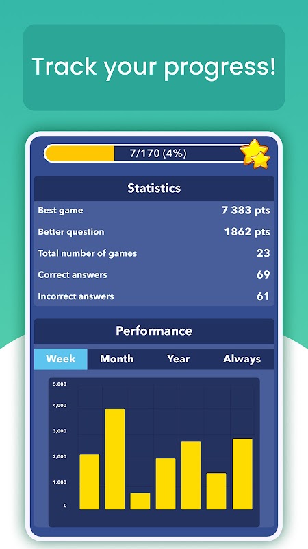 Kuis Trivial - Mengejar Pengetahuan menampilkan serangkaian statistik agar Anda dapat memantau performa Anda dalam permainan dan selalu berusaha untuk meningkatkan kemampuan terbaik Anda!