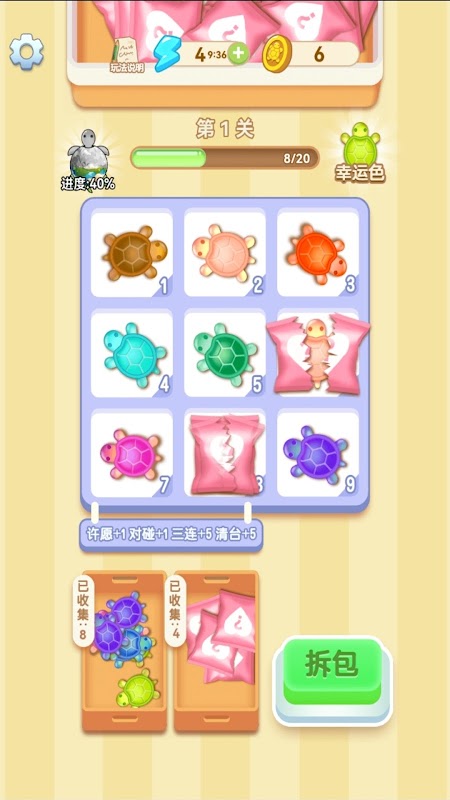 Anda perlu mengumpulkan tiga kura-kura dengan warna yang sama untuk terus melewati level.