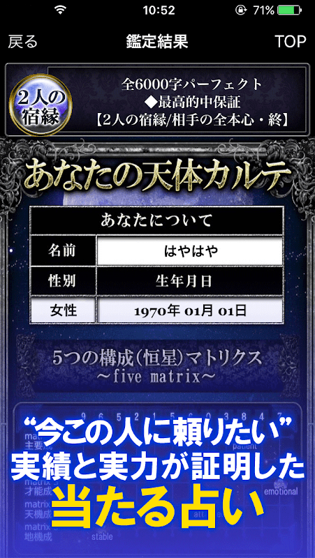 本鑑定であなたに提示される結果は、すべて根拠付けられた結論です。現実から目を背けず、受け入れてください。時に辛い現状に涙する事もあるかもしれません。しかし、あなたの前に存在する不安や悩み、課題や試練といった扉は、必ず開く事が可能です。そして、その先には幸福や成功が待っています。その扉を開く『鍵』を本鑑定で授けます。