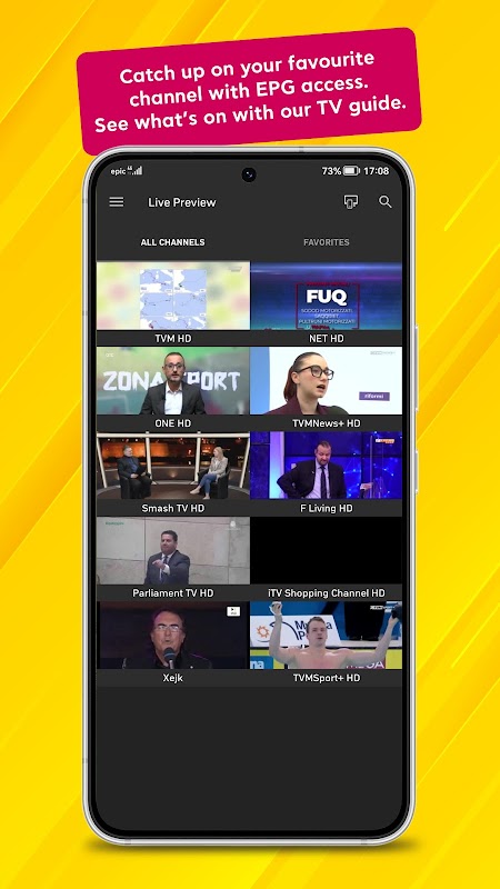 TV dengan aplikasi epik secara instan memungkinkan Anda untuk menikmati saluran favorit Anda. Ini disediakan gratis untuk semua pelanggan Epic TV. Sebagai pelanggan Epic TV, Anda dapat menonton berbagai program di hingga tiga perangkat dengan hingga dua aliran bersamaan pada saat yang bersamaan. Di aplikasi Anda dapat mengakses panduan program elektronik. Aplikasi ini juga memungkinkan Anda menjeda dan melanjutkan saluran TV langsung, merekam acara favorit Anda dan melihat rekaman yang ada, mengatur pengingat acara favorit Anda dan memutar ulang program TV sebelumnya dari tujuh hari terakhir. Apa pun yang dapat Anda lakukan dari remote TV, Anda dapat melakukannya dengan TV dengan aplikasi epik.