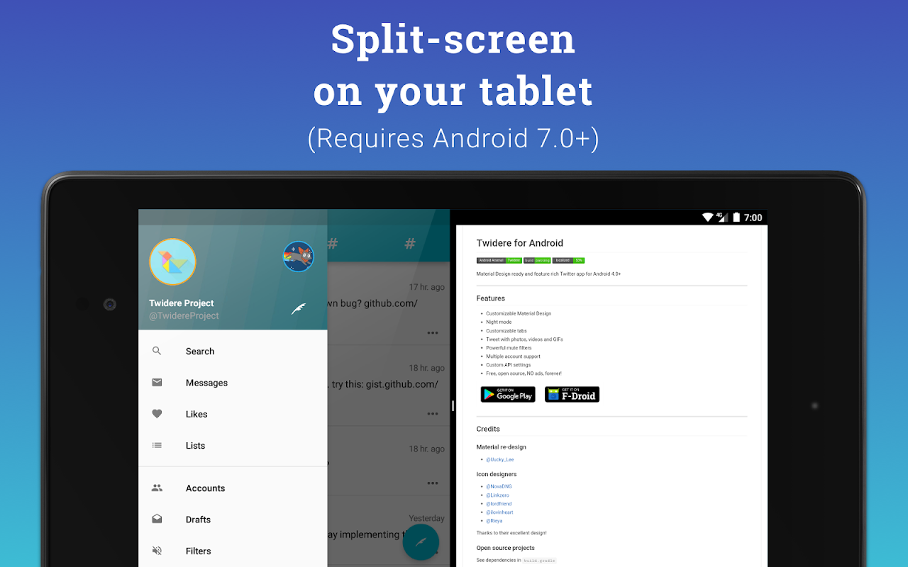Twidere adalah sebuah aplikasi Twitter/StatusNet/Fanfou berasaskan Material Design yang canggih, serta menyediakan fitur Twitter yang hampir lengkap (atau bahkan lebih baik).