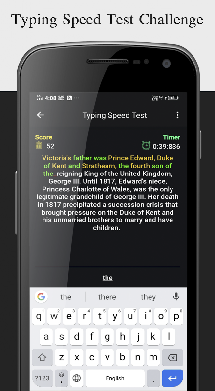 Aplikasi ini menyediakan paragraf yang perlu Anda ketik. Ada penghitung waktu 60 detik. Anda perlu mengetik kata sebanyak mungkin dalam waktu 60 detik. Skornya dalam format kata per menit.