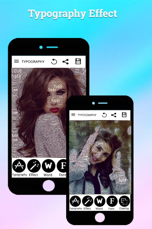 Add beautiful typography effect on photos, add filter effects, overlapping on photos, set amazing words with font styles and many more...