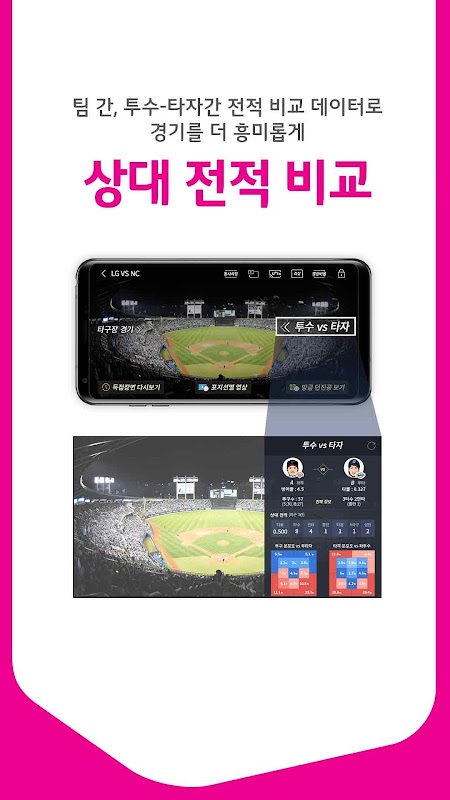- 지금 대결 중인 투수와 타자의 상대 전적을 실시간 중계 화면에서 확인하며 시청 할 수 있습니다.