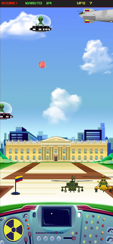 UFO menyerang Bogota DC. Tugas Anda adalah menghancurkan mereka. Gunakan sentuhan untuk mengatur garis silang pada UFO untuk meluncurkan bola energi. UFO Merah akan berhenti ketika layar disentuh; UFO ini bernilai 1 poin. UFO Hitam akan terus bergerak dan bernilai 4 poin. Skor akan berubah seiring berjalannya permainan.