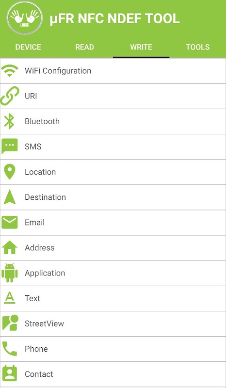 Perangkat lunak untuk pengkodean tag NFC menggunakan chip NFC ponsel atau Pembaca NFC µFR eksternal.