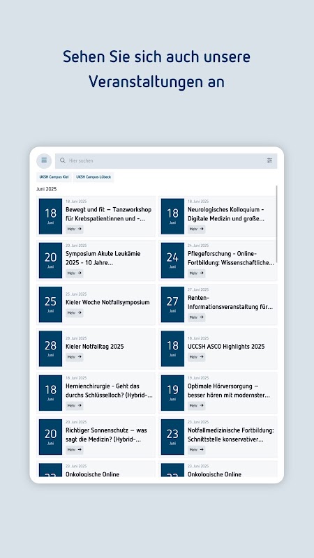Aplikasi UKSH: Aplikasi Rumah Sakit untuk Rumah Sakit Universitas Schleswig-Holstein dengan lokasinya di Kiel dan Lübeck.