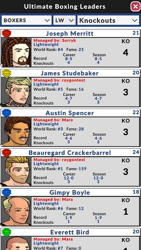 Bangun jajaran petinju impian Anda dan bersainglah dengan para manajer dari seluruh dunia. Para petinju Anda akan menua, berkembang, dan pensiun. Mereka akan bersaing memperebutkan gelar, mengikuti turnamen, dan meraih ketenaran dan kekayaan saat Anda bersaing dalam simulasi tinju yang terus berubah!