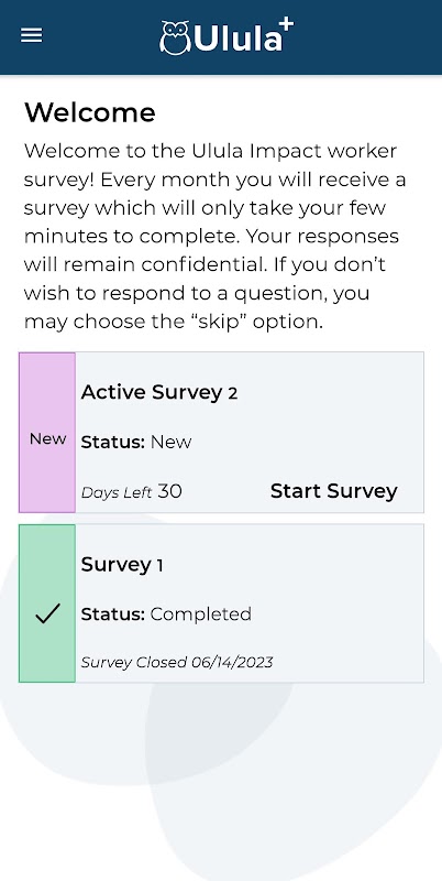 Ulula+ adalah aplikasi pendamping untuk rangkaian alat standar Ulula yang dirancang untuk digunakan oleh pekerja. Aplikasi ini memungkinkan pekerja untuk berbagi umpan balik anonim tentang kondisi kerja dan kesejahteraan dengan aman melalui survei dalam bahasa lokal mereka.
