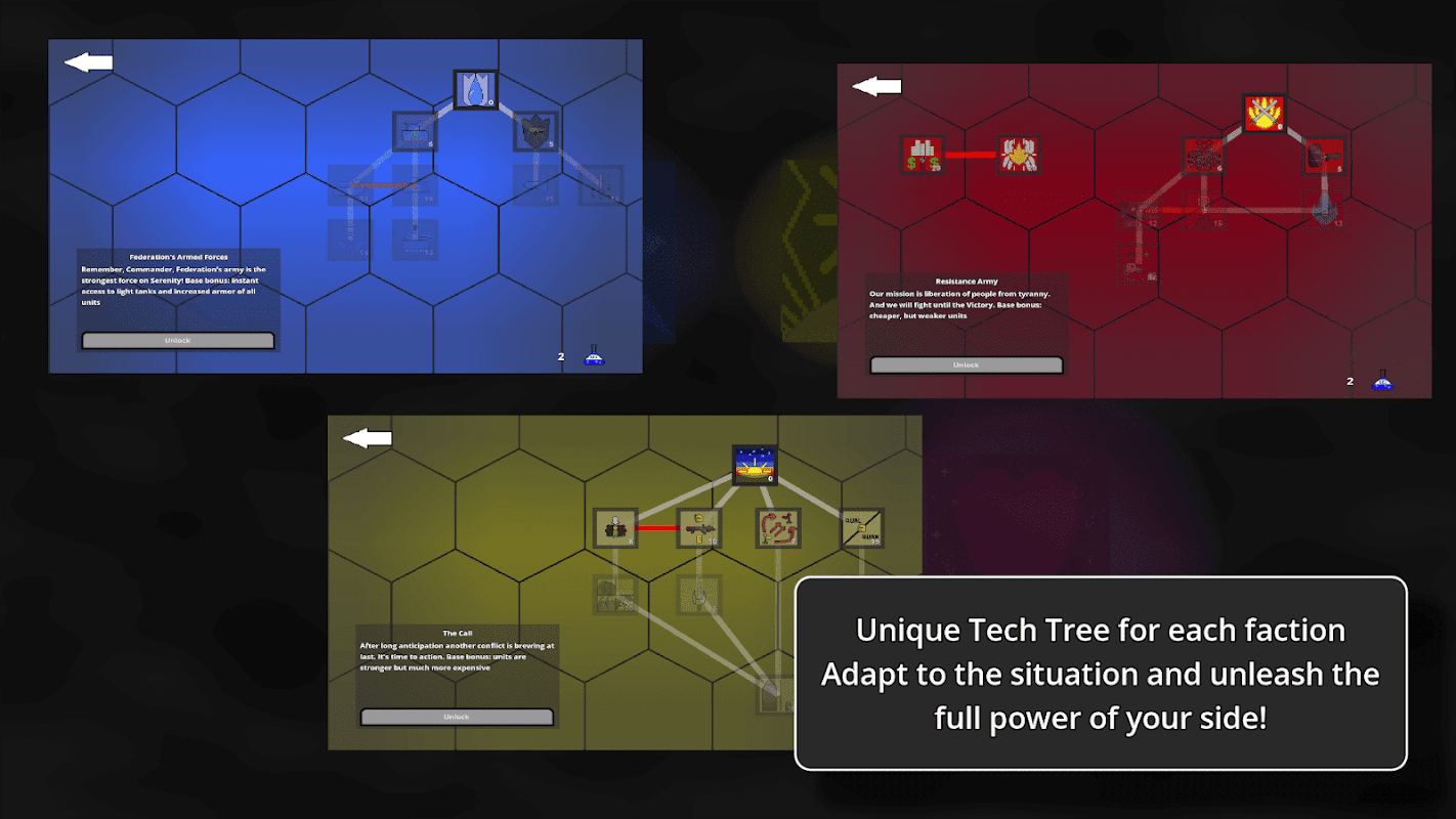 - 6 faksi, masing-masing dengan gaya bermain, taktik, strategi keseluruhan, pemilihan unit, dan pohon teknologi yang unik. Hancurkan dan hancurkan lawan dengan tank sebagai Federasi atau kalahkan mereka dengan unit murah berkualitas rendah sebagai pemberontak Red Inferno.