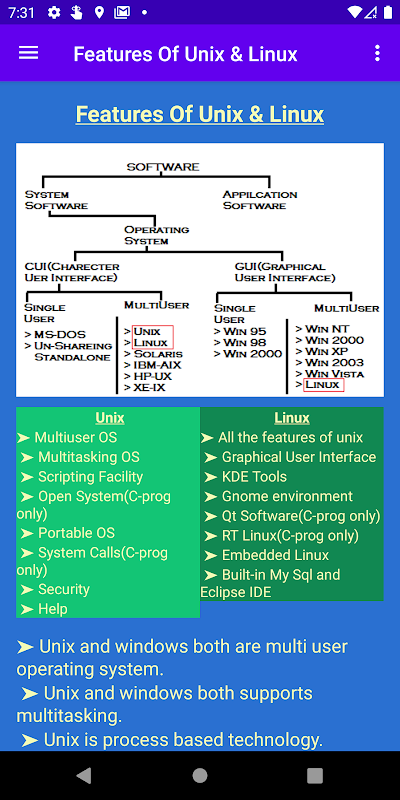 Di bawah ini adalah daftar Informasi yang disediakan tentang Unix dan Linux di APP ini.