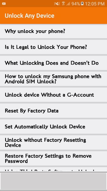 This app provides guide to unlock any android devices and others. Unlock any device by remove password, Hard reset, unlock without account and much more features. Everyone needs to secure data or preventing unauthorized use of his data in this modern era. One method to protect your phone data is to lock your phone screen by pattern, pin or in other way like face recognition. This app provide guide to solution of problems of device locking or unlocking. Easy Unlocking Guides Process Explained.