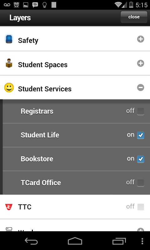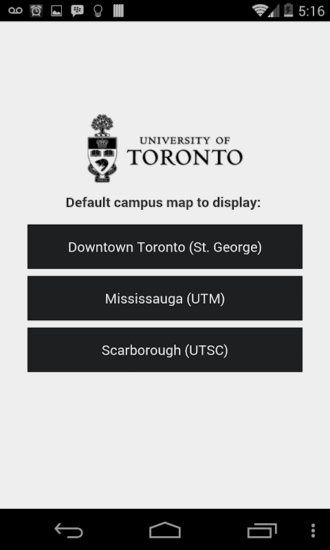 Google yang berbasis, peta ini berlapis dirancang untuk Android membantu anggota U of T masyarakat, khususnya orang-orang yang baru ke kampus (St George, Mississauga atau Scarborough), menavigasi menggunakan kata-kata pencarian yang bermakna, seperti "perpustakaan" dan "Panitera". Lapisan pertama meliputi peta aksesibilitas, makanan, nirkabel, layanan mahasiswa (termasuk pendaftar), parkir mobil, rak sepeda, stasiun kereta bawah tanah TTC, situs hijau (termasuk atap hijau dan baterai drop-off situs), keamanan, ruang belajar dan kamar kecil. Peta ini terdiri dari daftar lengkap dari semua bangunan dengan informasi tentang kantor dan layanan yang tersedia di dalamnya. Ini adalah peta yang hidup, salah satu yang akan mengembangkan lebih banyak lapisan seperti tumbuh.