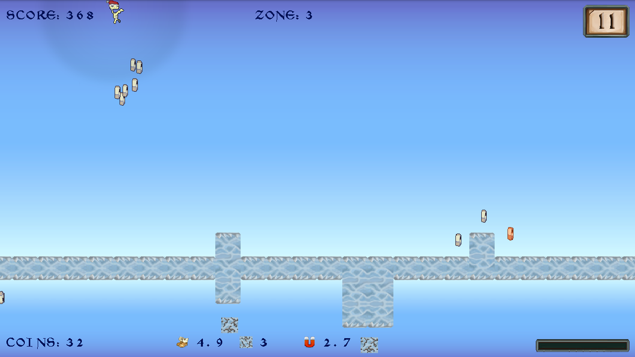 Game contains various characters, from funny Chicken to frightening Cobold, hats for them to wear and skills that will help you to run longer and reach further locations. Most skills can be upgraded, allowing you to touch the sky with Winged Boots or smash through the obstacles using Block Breaker. All the fun is accompanied by vibrant tunes.