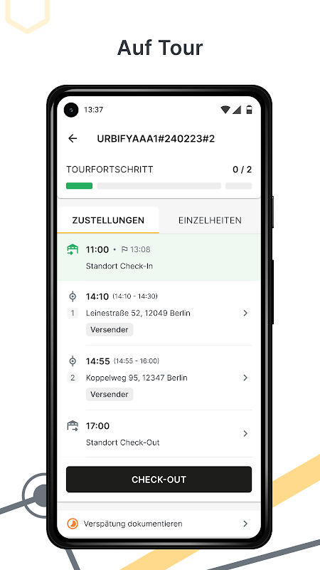 Aplikasi Urbify adalah antarmuka digital bagi pengemudi pengiriman untuk terhubung ke sistem Urbify dan memiliki semua informasi yang relevan setiap saat. Urbify menggunakan GPS dan teknologi lokasi untuk menciptakan transparansi di seluruh proses pengiriman dan memungkinkan pengiriman non-interaktif di sepanjang proses yang ditentukan. Dengan bantuan navigasi dalam aplikasi, pengemudi pengiriman dapat dengan cepat menemukan alamat pengiriman mereka dan tidak memerlukan aplikasi lebih lanjut.