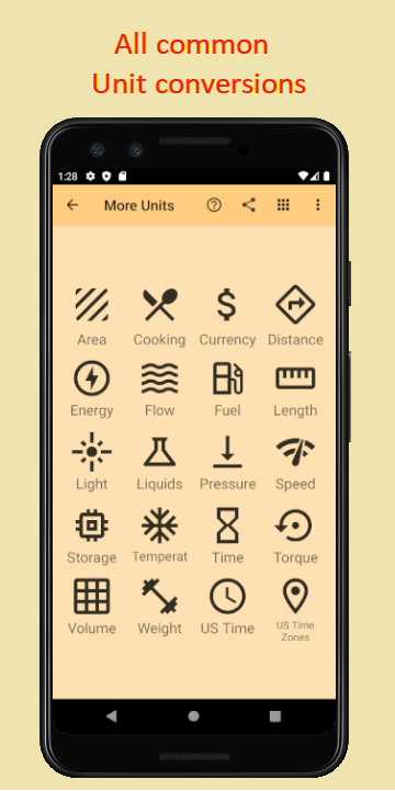 Semua unit umum untuk berbelanja / di rumah / bepergian tersedia di layar beranda, tidak perlu memilih unit atau beralih layar. Termasuk konversi Area, Memasak, Jarak, Panjang, Berat, Volume.