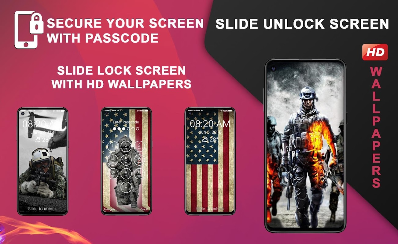 USA Soldiers Wallpapers Slide Unlock Screen is the best keypad lock screen like phone lock screen to set password/passcode/pin for your lock screen.