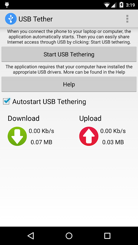 Usb Tether is a simple application that help you share Internet connection from your smartphone to your computer through usb connection. When you connect the phone to your laptop or computer, the application automatically starts. Then you can easily share Internet access through USB by clicking: Start USB tethering.