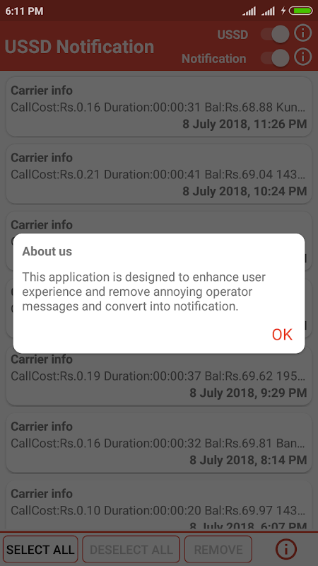 Pemberitahuan USSD adalah aplikasi sederhana yang menghapus pesan yang dikirim oleh operator seluler Anda, dan menyimpannya di Aplikasi untuk referensi di masa mendatang. Juga izinkan pengguna untuk mengubah pesan itu menjadi pemberitahuan