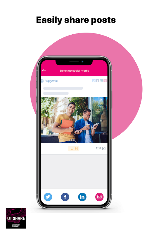 UT Share adalah aplikasi branding Sosial yang dapat Anda gunakan secara strategis untuk mempublikasikan, menganalisis, mengiklankan, dan berkolaborasi dengan semua tim organisasi. Anda mengonversi cerita autentik dari karyawan atau pemangku kepentingan lainnya menjadi konten media sosial unik yang dapat dibagikan oleh semua orang di dalam organisasi. Platform ini juga cocok untuk pendekatan media sosial top-down yang strategis. Apakah Anda ingin melibatkan karyawan, pengusaha waralaba, reseller atau pemangku kepentingan lainnya dalam penggunaan media sosial. Dengan UT Share Anda menciptakan jangkauan yang sangat relevan melalui saluran pribadi dan saluran bisnis dari semua orang yang terlibat.