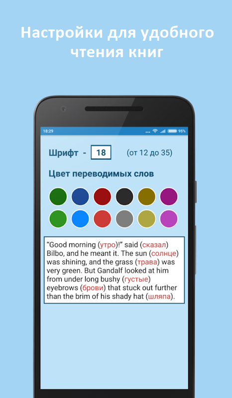 - режим чтения с возможностью показа перевода слов просто по одному клику!
