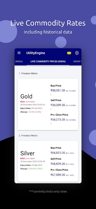 Untuk pengguna di India, UtilityEngine menyediakan tarif bahan bakar langsung harian, termasuk harga bensin dan solar. Dapatkan informasi terkini tentang harga komoditas, termasuk emas, perak, minyak mentah, dan lainnya dengan harga komoditas MCX langsung.