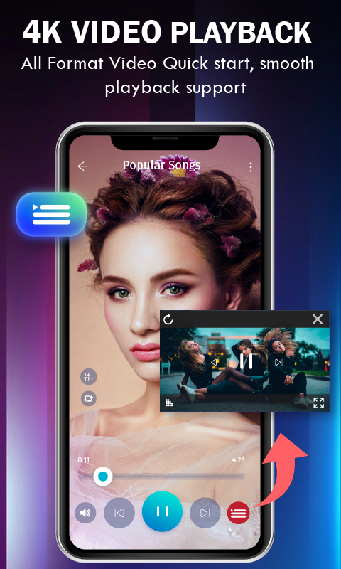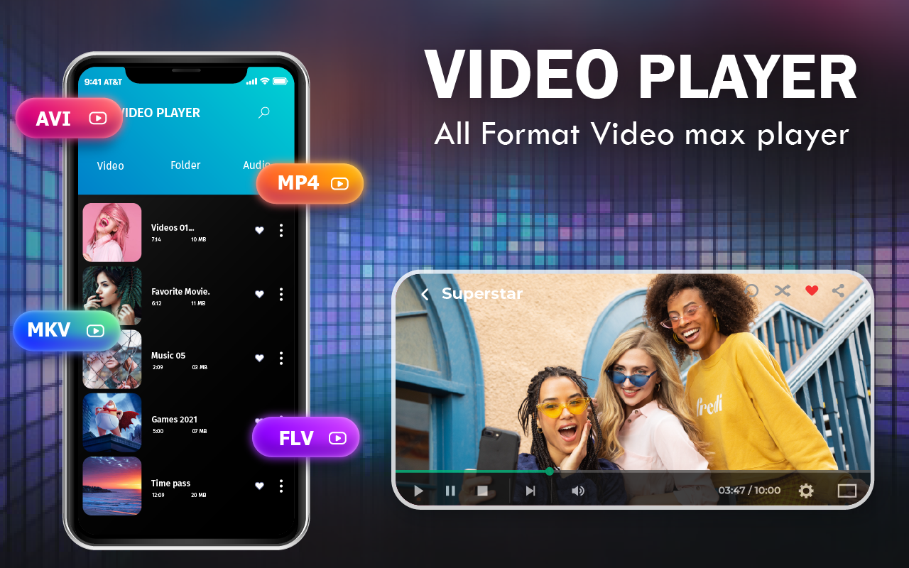 Pemutar video mendukung semua format video termasuk M4V, MP4, WMV, AVI, TS, MKV, RMVB, 3GP, dan lainnya.