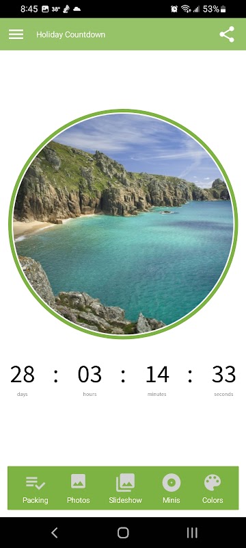 Bersiaplah untuk petualangan Anda selanjutnya dengan Vacation Countdown! Aplikasi ini memudahkan Anda untuk merencanakan dan mengatur perjalanan Anda dengan daftar kemasan yang dapat disesuaikan, tayangan slide foto, dan widget mini yang dapat Anda bagikan dengan teman dan keluarga di hampir semua platform yang Anda sukai seperti Facebook, Instagram, Twitter, dan bahkan melalui pesan teks atau email. Lacak hitungan mundur Anda, unggah foto Anda sendiri, dan kirim email atau cetak daftar kemasan Anda. Semua yang Anda butuhkan untuk mempersiapkan perjalanan Anda di satu tempat yang nyaman.
