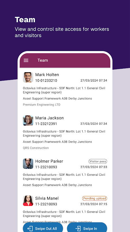 Pengontrol akses dapat mengakses semua fitur ini. Pemeriksa titik dapat melihat kartu cek, melihat daftar pengumpulan dan mengubah lokasi. Pekerja mandiri dapat masuk dan keluar situs, mengubah lokasi, dan memeriksa detail kartu mereka.