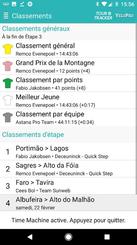 Dengan aplikasi VeloPro.fr, Anda dapat mengikuti balapan dengan cara yang unik berkat informasi yang datang langsung dari mobil balap kami, peta dan profil interaktif, pelacakan GPS waktu nyata. Juga temukan semua peringkat, presentasi panggung, ringkasan lomba dan banyak fitur lainnya.