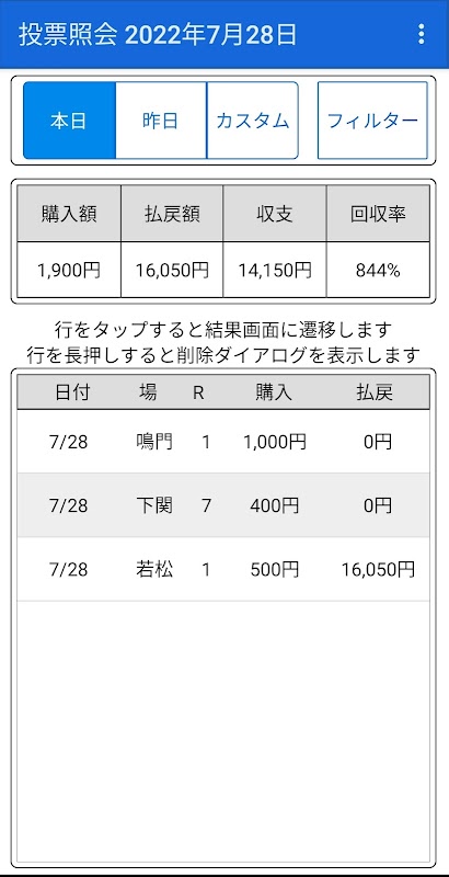 Ini adalah permainan voting tiket kapal untuk kapal motor. Anda dapat memprediksi dan berlatih tiket kapal dengan simulasi. Informasi balapan cocok dengan siaran langsung. Manajemen saldo dan memo juga dimungkinkan.