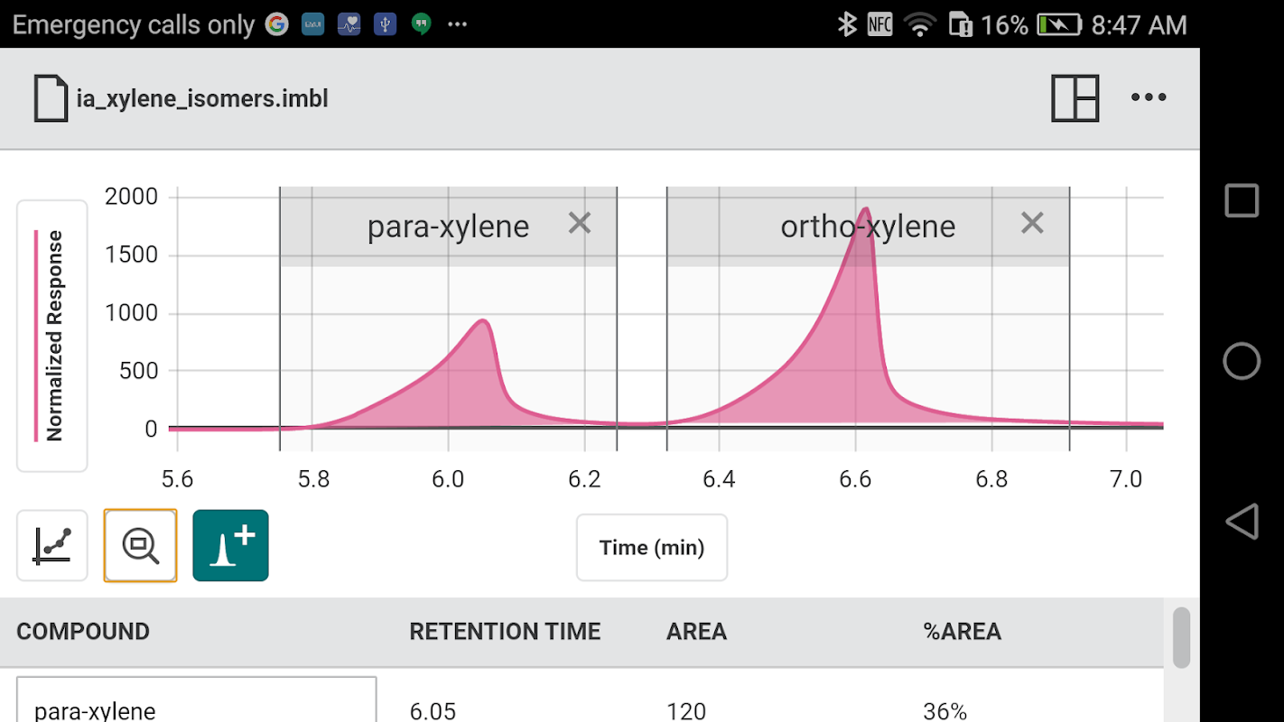 Siswa dapat mengumpulkan kromatogram gas dari Vernier Mini GC, Mini GC Plus, dan Go Direct Mini GC. Mereka juga dapat menentukan area puncak dan mengintegrasikan puncak.