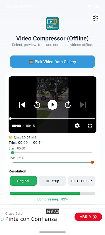 Pilih video apa pun dari galeri Anda dengan mudah, pilih resolusi yang diinginkan (1080p, 720p, atau asli), dan biarkan aplikasi mengompresnya dalam hitungan detik. Dirancang untuk kesederhanaan, kecepatan, dan hasil profesional.