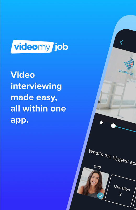 Video mewawancarai dibuat mudah. Gunakan kode unik Anda untuk memulai menjawab pertanyaan disesuaikan untuk Anda dan kemudian menggunakan sistem perekaman video untuk mengirim jawaban Anda dengan cepat dan mudah.