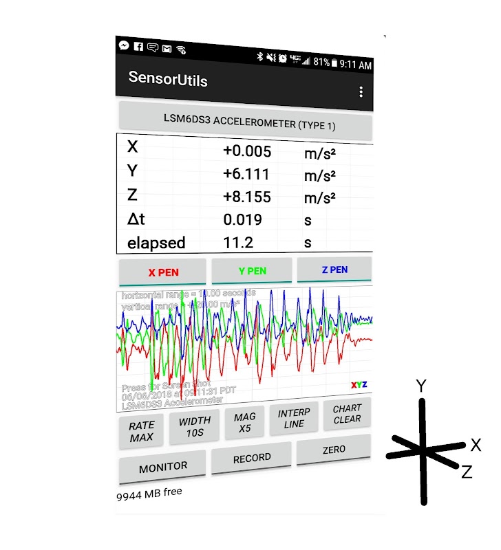 SensorUtils is a utility program built around the notion of a strip-chart recorder. Inputs to the recorder are sensors built into the Android device. The recorder displays graphically the sensor readings on a strip-chart like graph. There are three channels on the recorder that can used for each sensor. The strip-chart graph can be saved as a screen shot (device app) or data collected can be saved to a file.