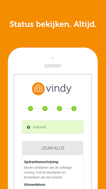 Dengan aplikasi Vindy Anda dapat dengan mudah mengelola semua pekerjaan Anda di dalam dan di sekitar rumah. Setelah Anda menempatkan pekerjaan di situs web kami, kami akan menyiapkan dasbor pribadi untuk pekerjaan Anda.