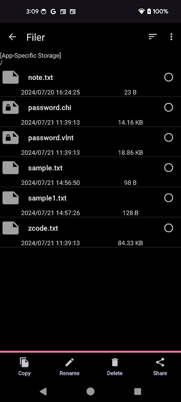Ini mendukung banyak fungsi untuk file dalam penyimpanan khusus aplikasi (menyalin, menghapus, mengganti nama, berbagi, membuat folder, mengekspor, mengimpor, mencadangkan, dan memulihkan) dalam mode filer (Ini tidak termasuk fungsi untuk penyimpanan bersama. Gunakan aplikasi lain seperti 'File oleh Google').
