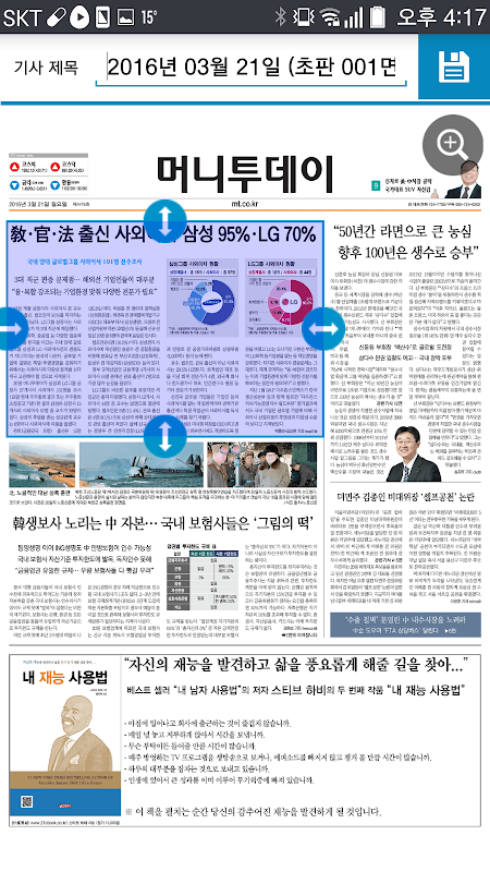 신문발행일 전날 제작되는 종이 신문 초판을 저녁 6시30분 마감과 동시에 볼 수 있으며, 머니투데이 신문을 지면 형태 그대로 볼 수 있습니다. 스크랩, 메모, 검색기능을 지원하며, 지면형태와 텍스트 형태로도 열람이 가능하여 다양하고 편리한 경험을 독자에게 제공합니다.